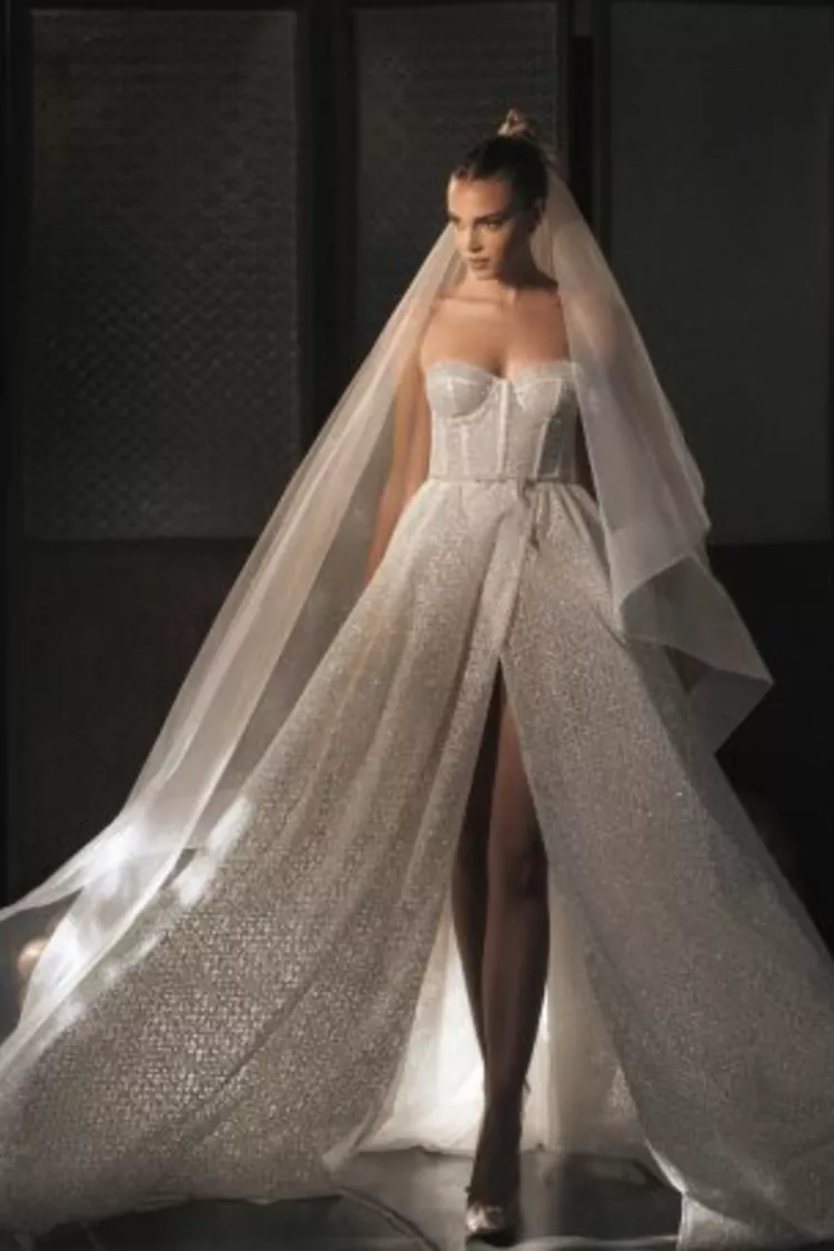 Fashion-forward, iconic, and utterly mesmerizing—we could go on and on! This leg-bearing, shimmer-infused beauty by Berta simply speaks for itself.