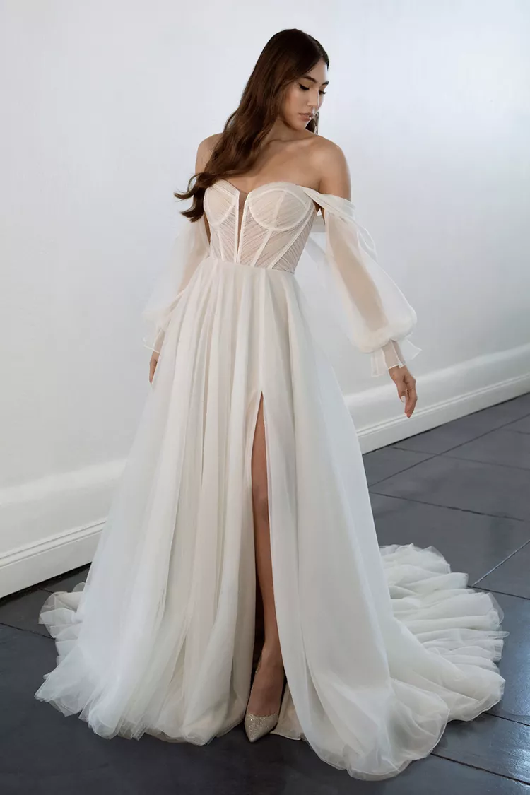 This is the epitome of an ethereal bridal dream. You’re bound to turn heads in this layered organza gown featuring a modern corset bodice, thigh-high slit, and detachable sleeves.