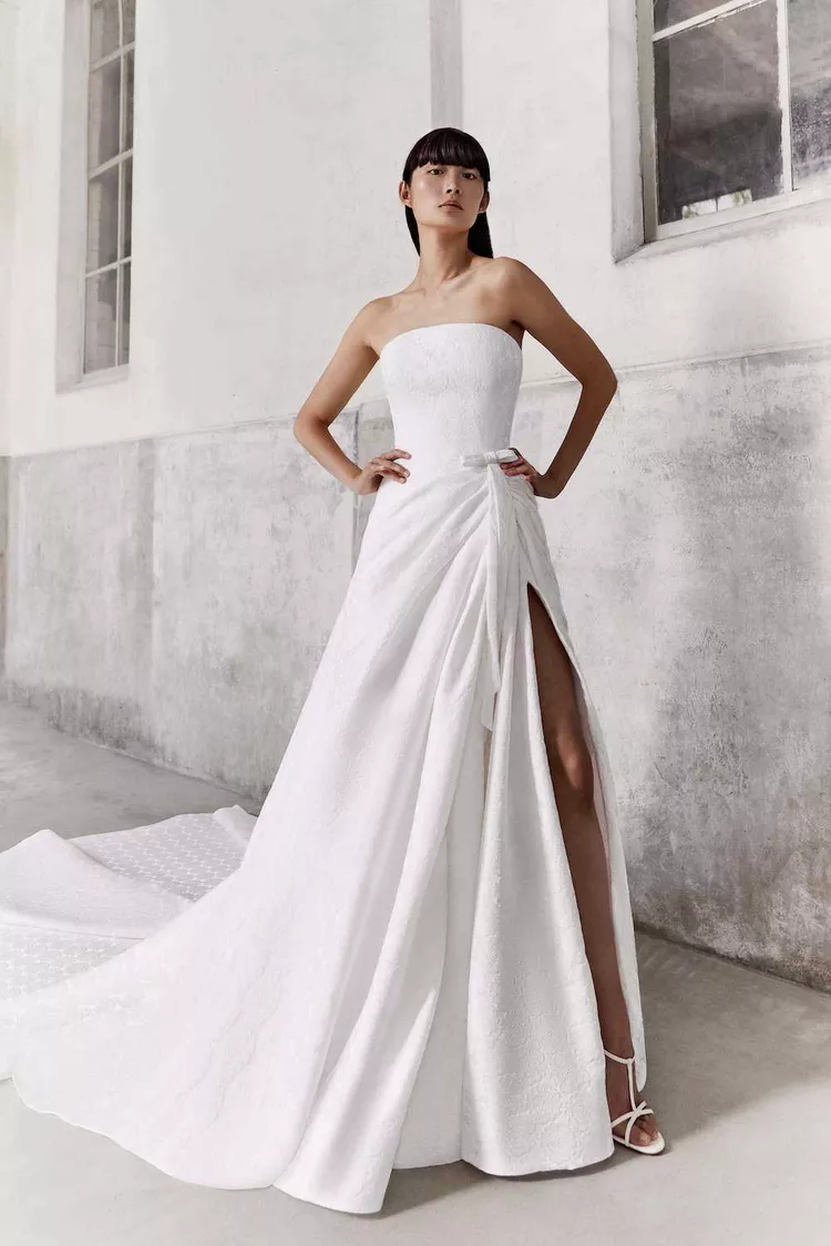 Between the strapless neckline, bow detailing, and slit, this floral jacquard look is nothing short of perfection. This gown would look beautiful at a garden wedding, no doubt!