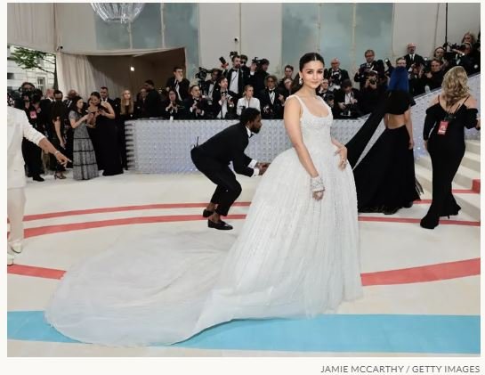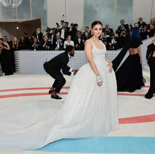 The train on Alia Bhatt’s wedding gown designed by Prabal Gurung was simply mesmerizing! Drawing inspiration from Chanel’s signature aesthetics, Gurung crafted an alluring drop-waist dress featuring an allover pearl-encrusted design with a full cathedral train. The outfit exuded sophistication and glamour, and Bhatt carried it off with effortless grace. The train added an element of drama to the ensemble, making it one of the most unforgettable looks of the evening.
