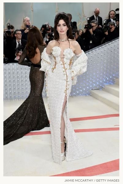 Anne Hathaway’s Atelier Versace gown at the Met Gala was a stunning interpretation of the Chanel bride look, with a sexy twist. The dress would be perfect for formal engagement parties or rehearsal dinners, and is ideal for brides who prefer a more maximalist aesthetic.