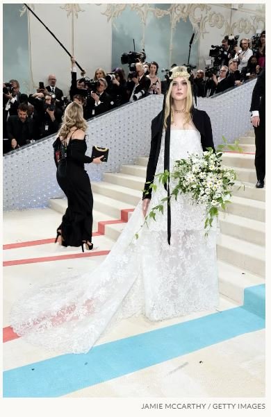 It sounds like Elle Fanning’s Met Gala look was the perfect mix of classic bridal elements and modern twists. The white lace gown from Vivienne Westwood likely gave off a romantic and traditional vibe, while the black jacket provided a edgy and unexpected touch. And, of course, the flower crown and bouquet added a touch of whimsy and nature-inspired beauty.