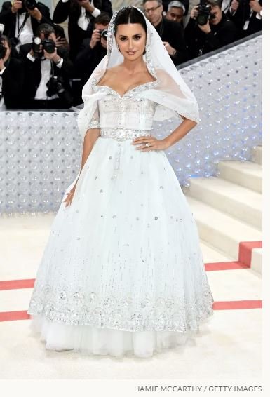 Penélope Cruz was a vision of beauty at the 2023 Met Gala in a vintage hooded ensemble from Chanel Couture’s Spring/Summer 1988 collection. Her exquisite wedding-inspired outfit featured white pearl buttons, a full ball gown skirt, and intricate silver sequin embellishments, making it one of the most breathtaking looks of the night. Cruz looked every bit the fairytale bride in this enchanting creation.