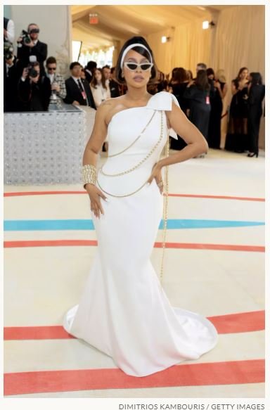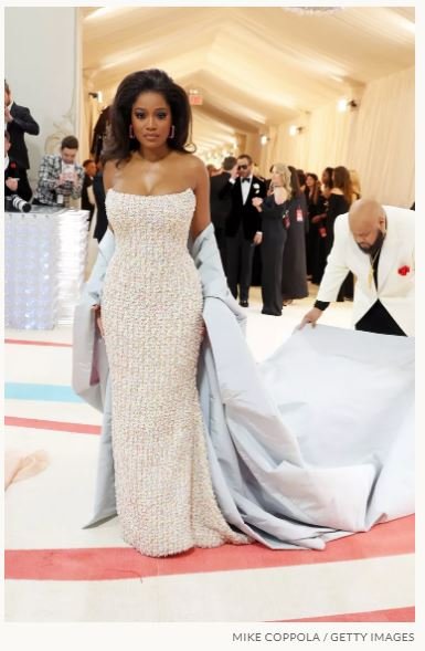 Keke Palmer was a vision of elegance and beauty at the 2023 Met Gala, wearing a stunning strapless design by Sergio Hudson. The dress featured Lagerfeld’s signature Chanel fabric, tweed, which was a perfect choice for the event. Palmer also gave a subtle nod to bridal wear with her “something blue” cape, which doubled as a train, adding a touch of drama to her overall look. The outfit was a perfect blend of classic and modern styles, showcasing Palmer’s impeccable fashion sense and making her one of the standout stars of the evening.