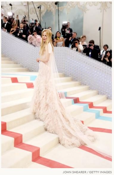 Nicole Kidman graced the 2023 Met Gala in a vintage Chanel gown, originally featured in the brand’s former Chanel N°5 advertising campaign. The beautiful blush hue, intricate feather embroidery, and veil-like shoulder streamers made it a perfect bridal-inspired outfit. The elegant dress showcased Kidman’s refined taste and sense of style, while the subtle embellishments added a touch of glamour to the overall look. It was a stunning ensemble that perfectly captured the essence of a fairytale bride.