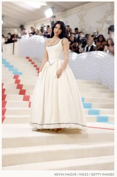 Dua Lipa made a striking statement at the 2023 Met Gala with a stunning white ball gown from Chanel’s 1992 Haute Couture collection. The vintage outfit boasted a drop waistline, scoop-neck silhouette, and a full skirt, exuding sophistication and glamour. It was an excellent choice for brides who appreciate the elegant and baroque style, and Dua Lipa carried it off with effortless grace.