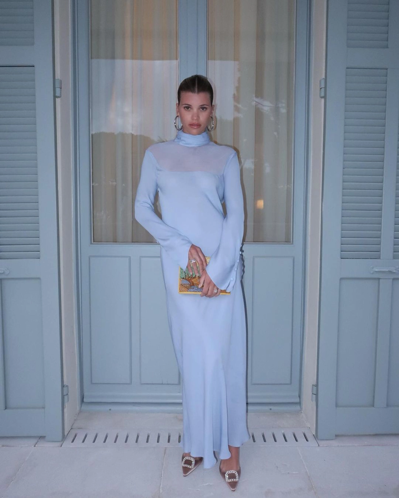 She found her something blue! Richie looked elegant as ever in a periwinkle Khaite Leibel Dress ($1,880), Jennifer Fisher Law Hoops ($450), Olympia Le-Tan Book Clutch ($1,337, originally $1,782) and pearl-studded Manolo Blahnik Mules ($1,466) for an evening event.