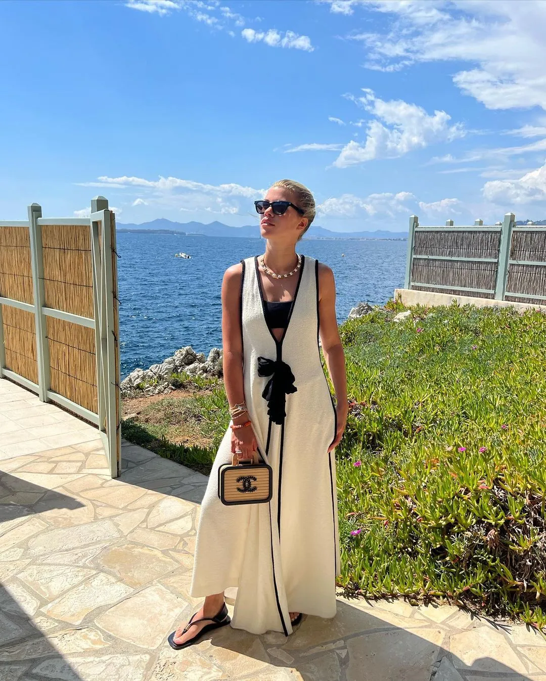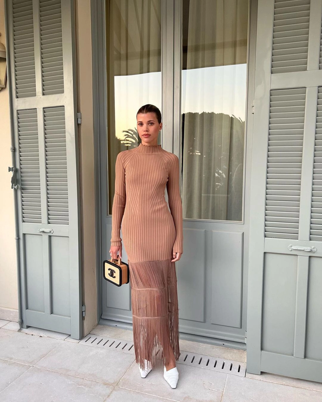 Upon arriving in Antibes, France, Richie styled Khaite’s Cedar Dress ($2,400) and pointy-toed white Water Pumps ($880) with a boxy wooden Chanel bag.