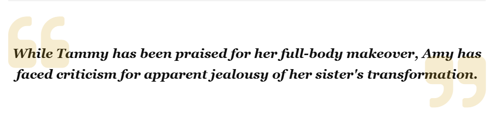 While Tammy continues to enjoy the spotlight for her incredible makeover, Amy has faced some online criticism, with fans speculating that she might be envious of her sister’s success. However, Amy has remained silent on those rumors, choosing instead to focus her energy on building a new path as an artist.
