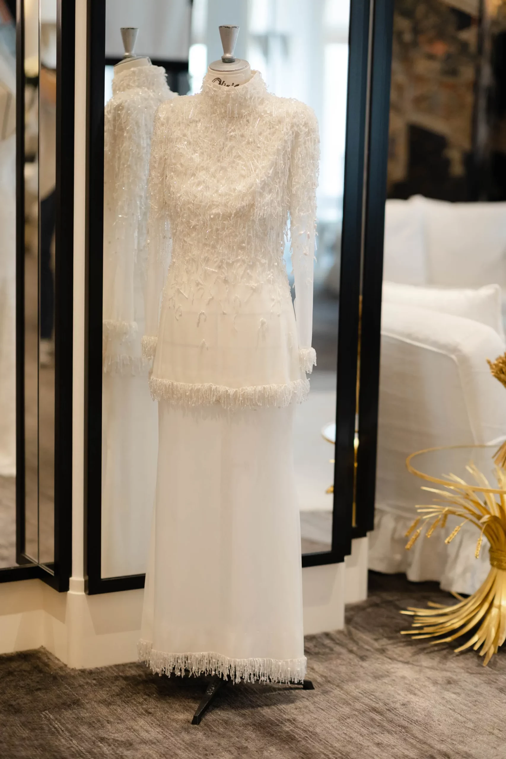 First, Richie tries on the high-necked, long-sleeved beaded dress she wore on Friday night to the rehearsal dinner.