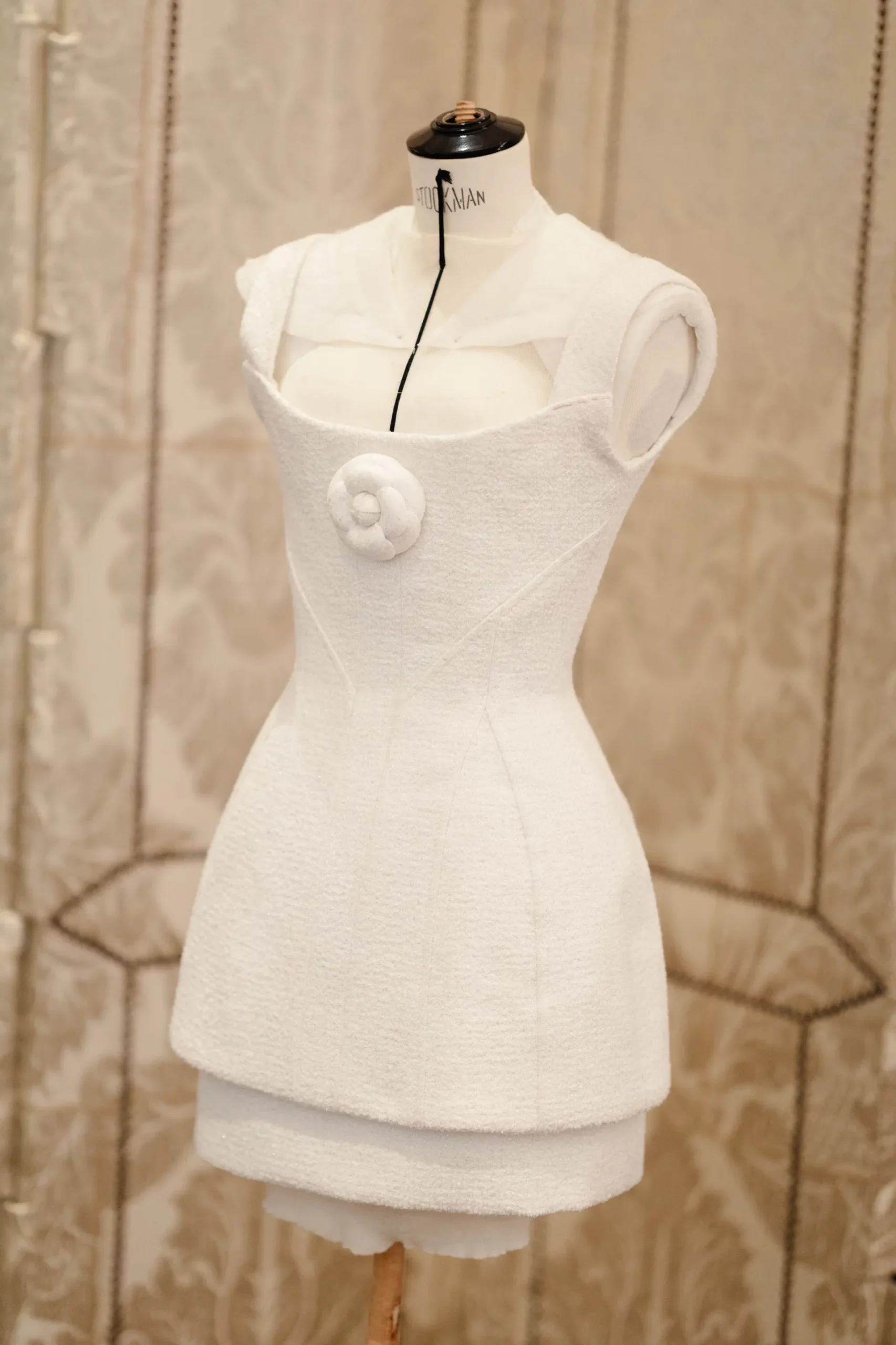 The bride with her short, white after-party dress featuring the Chanel camellia front and center.
