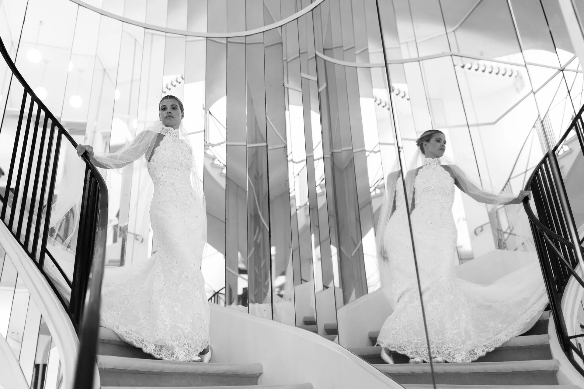 The bride makes her way down the stairs at the Chanel haute couture salons.