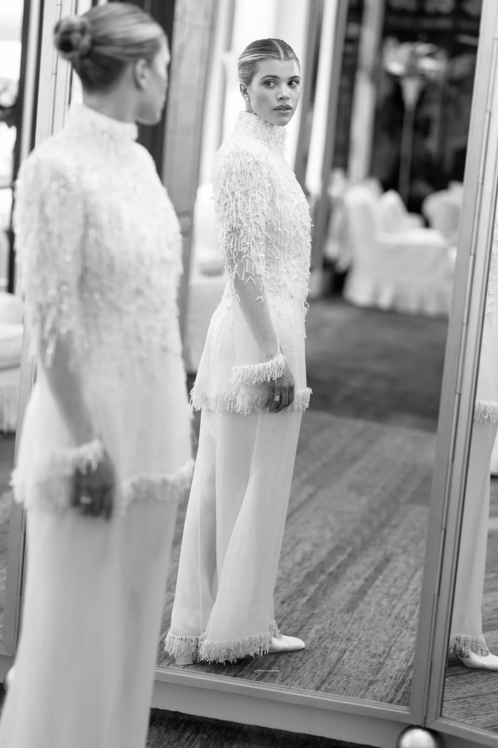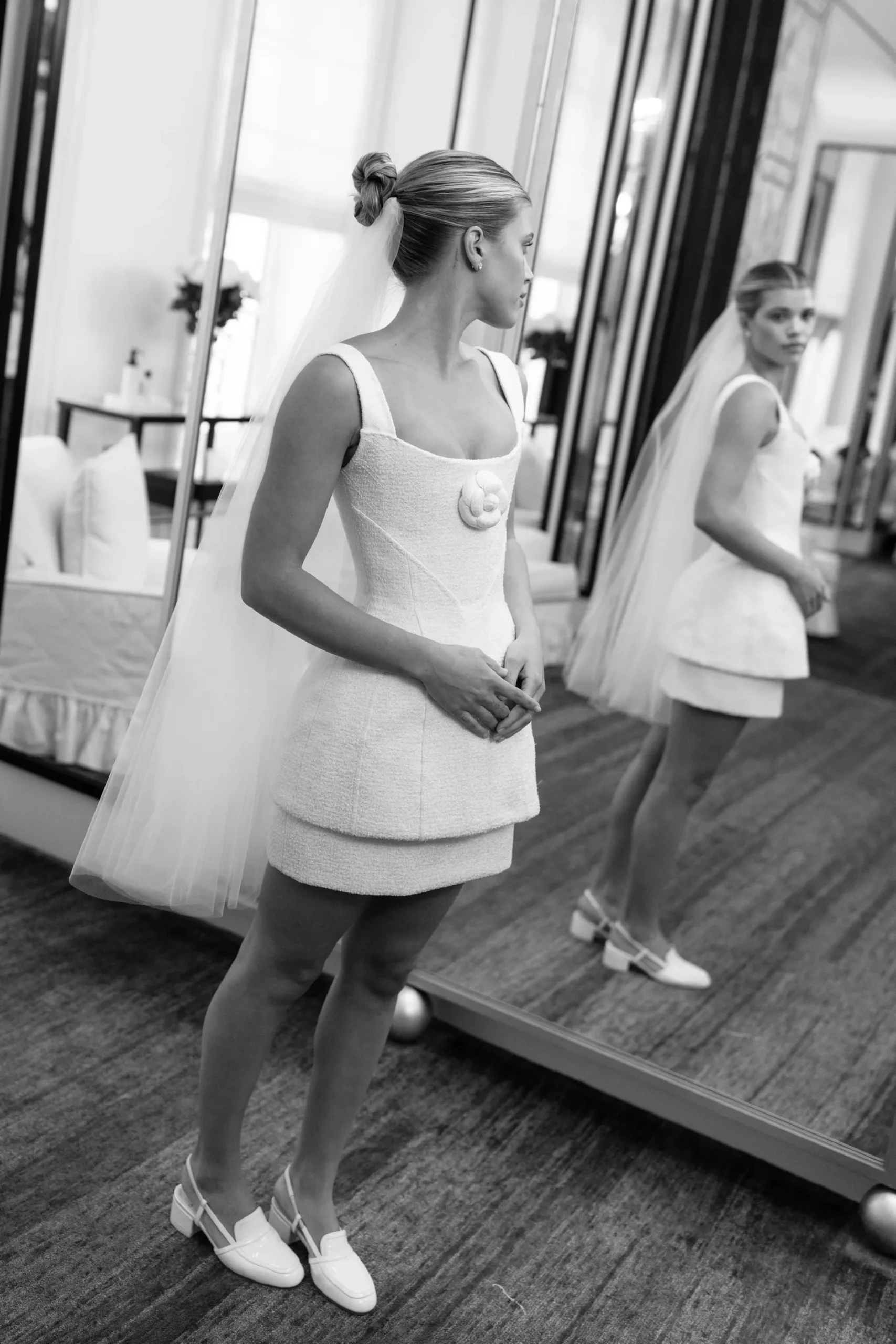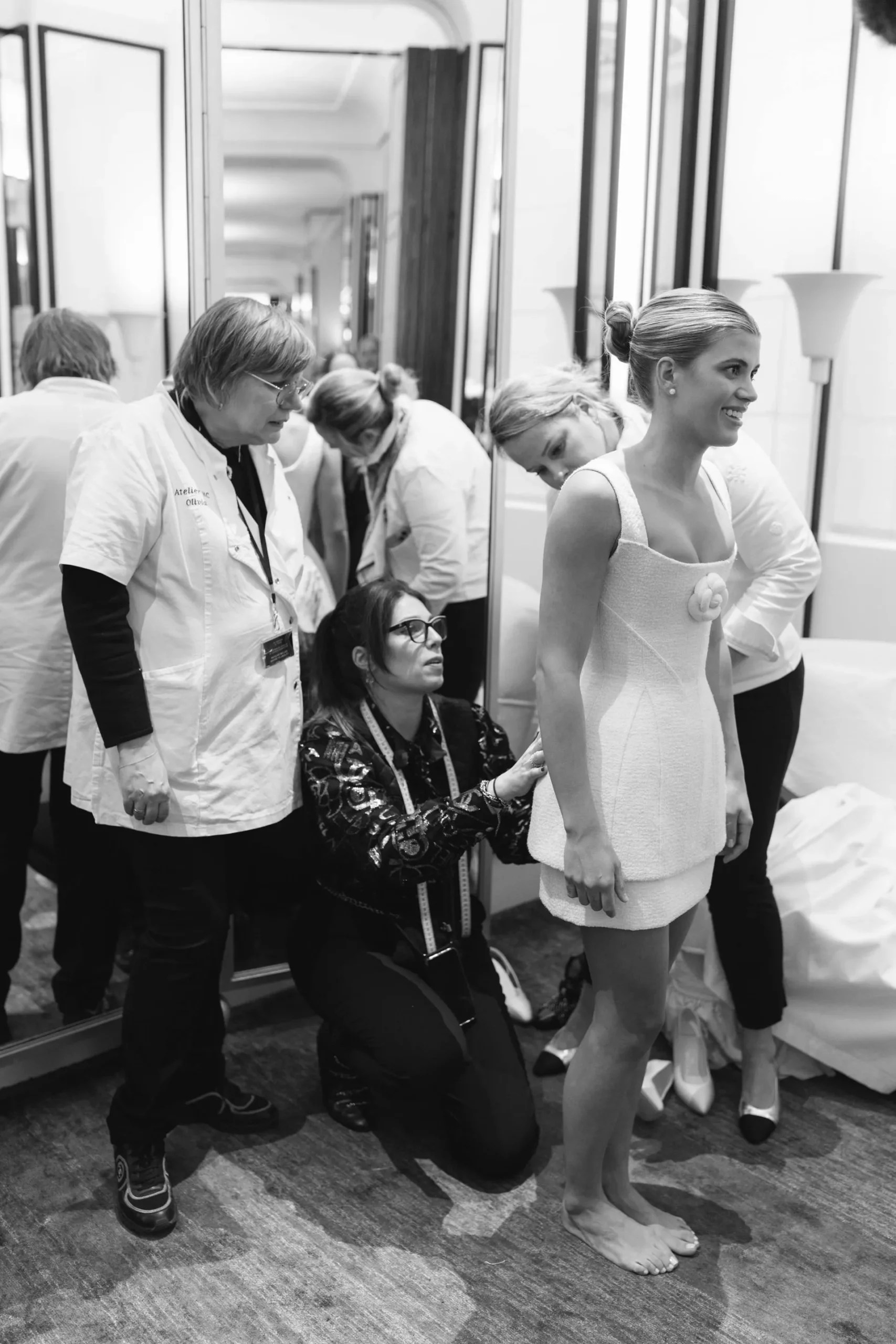 Finally, Richie steps into her wedding dress—a unique bridal silhouette with a criss-cross neckline inspired by a look from Chanel’s fall 2023 collection. “We created the top of that dress and made it bridal-y,” Richie says, while Madame Olivia Douchez, première of haute couture atelier, ensures all of the details of the dress’s iridescent white sequins are just so. “It is such magic,” Richie adds. “I honestly think Elliot is going to love it. He is my biggest cheerleader when it comes to anything I wear. If he doesn’t cry, I’ll be very sad.”