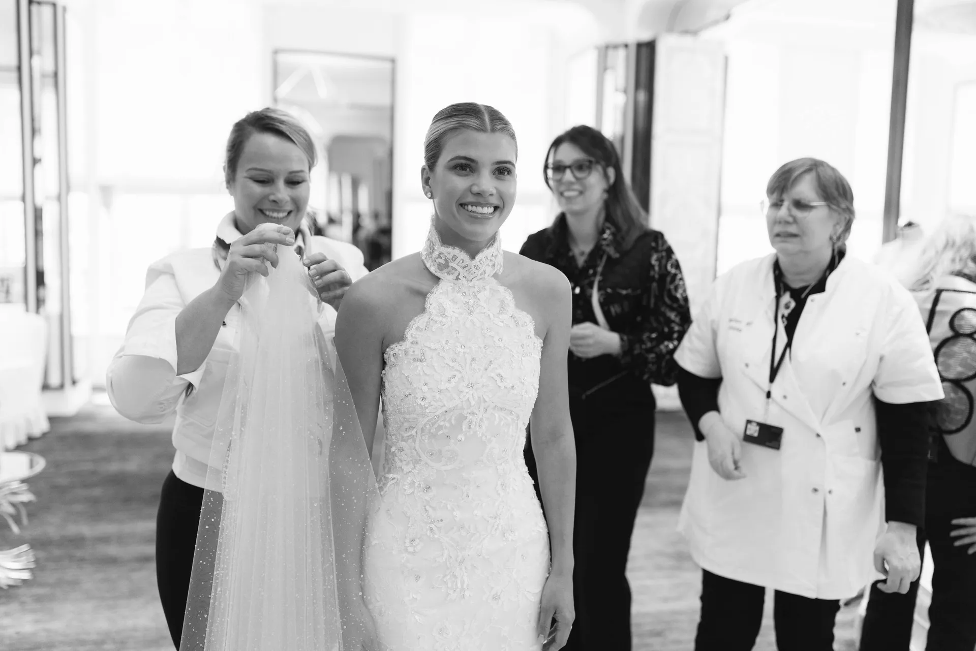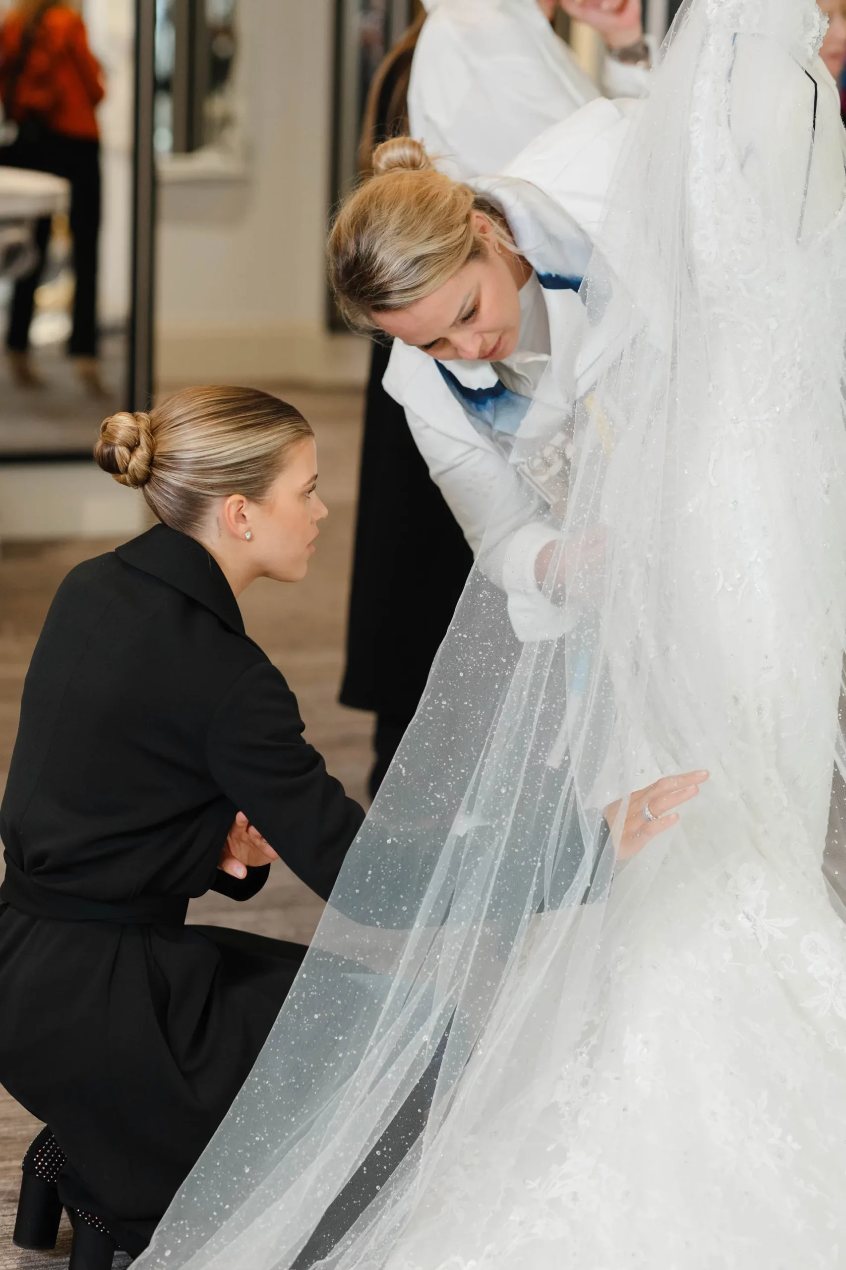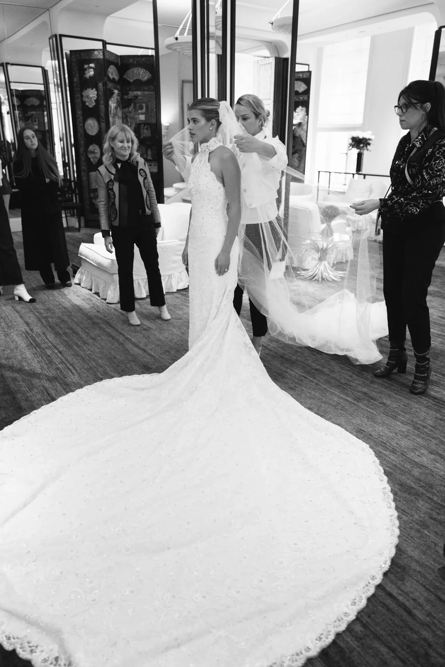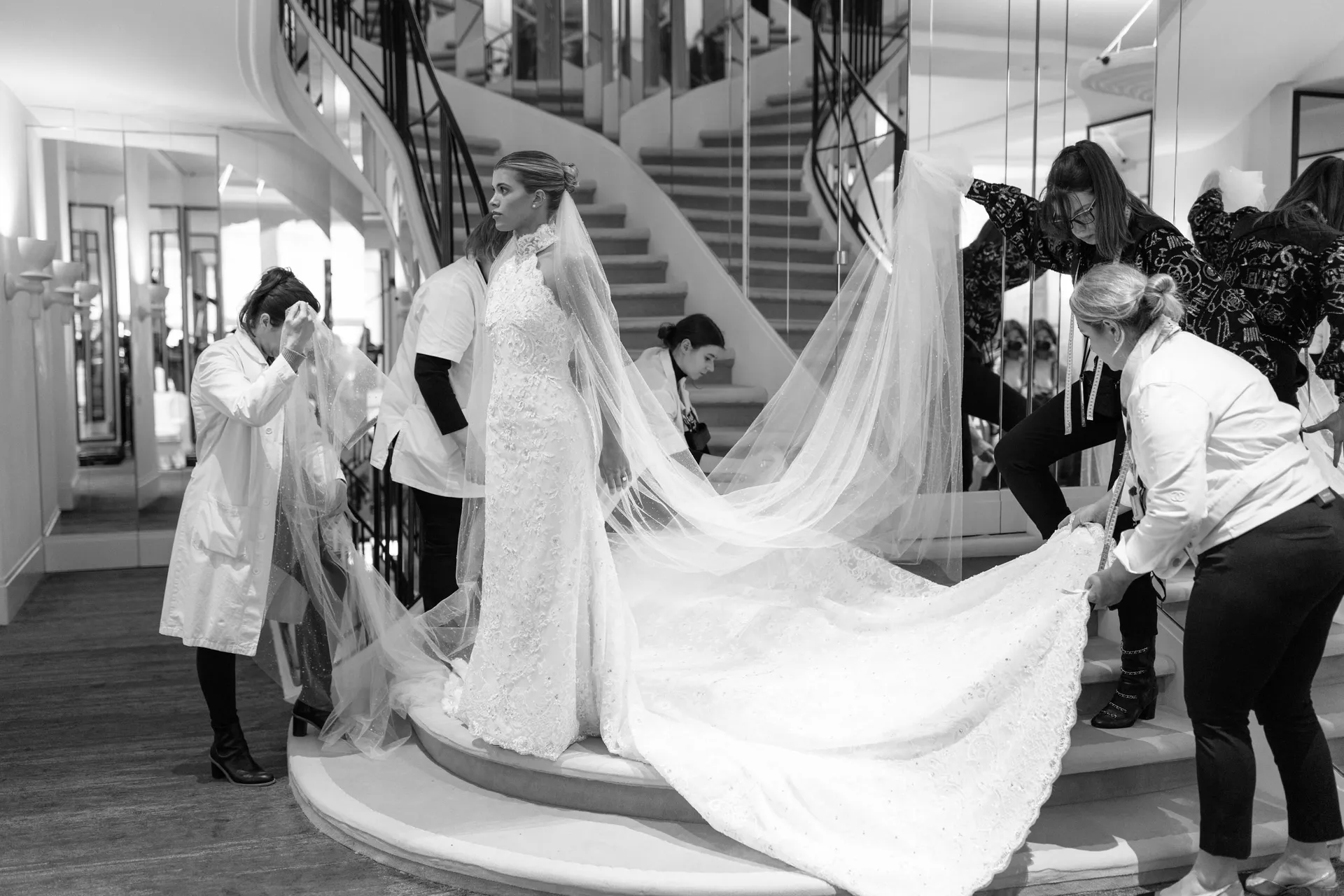 Finally, Richie steps into her wedding dress—a unique bridal silhouette with a criss-cross neckline inspired by a look from Chanel’s fall 2023 collection. “We created the top of that dress and made it bridal-y,” Richie says, while Madame Olivia Douchez, première of haute couture atelier, ensures all of the details of the dress’s iridescent white sequins are just so. “It is such magic,” Richie adds. “I honestly think Elliot is going to love it. He is my biggest cheerleader when it comes to anything I wear. If he doesn’t cry, I’ll be very sad.”