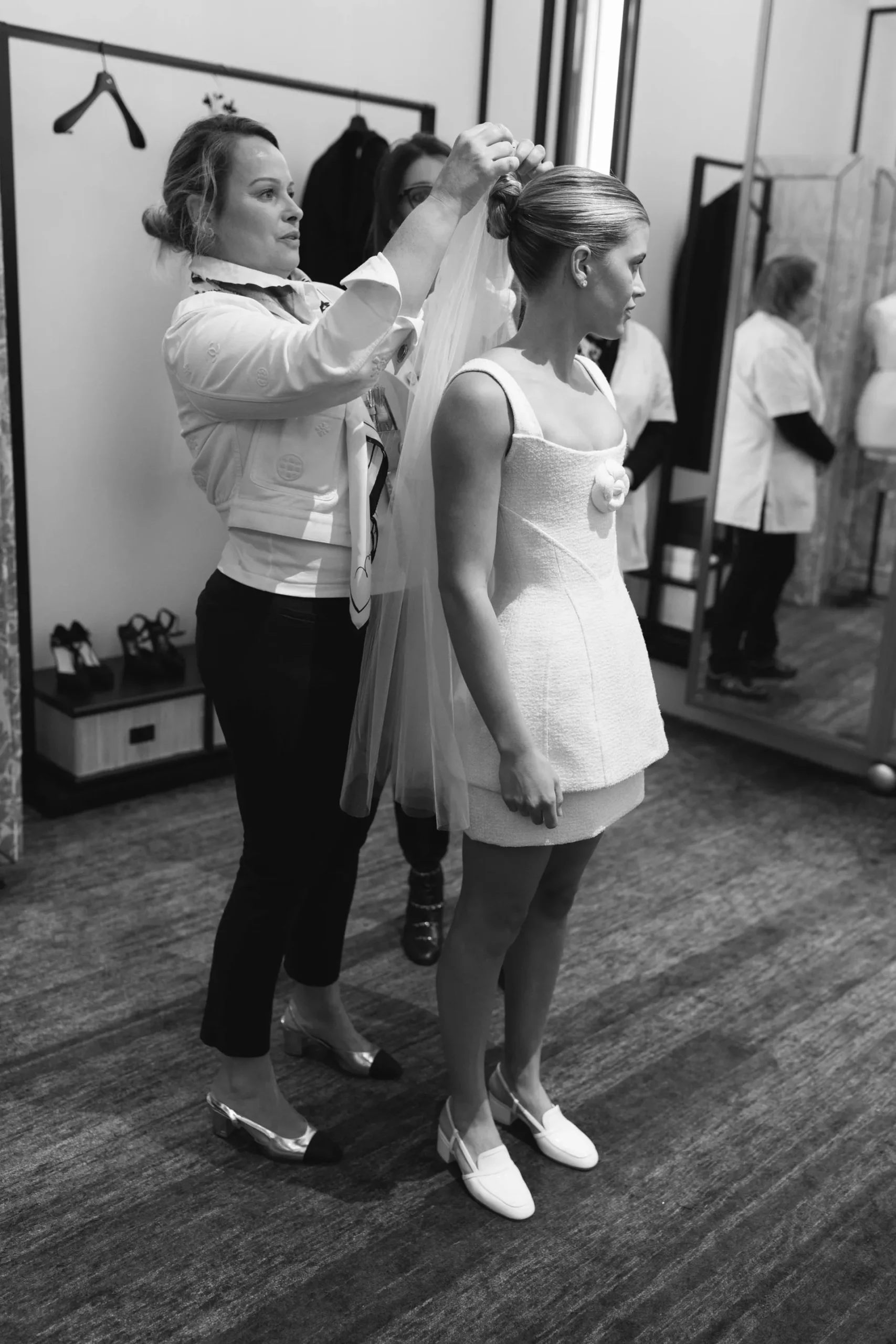 It’s not lost on the bride that to be in the Chanel haute couture salons trying on not one, but three custom wedding dresses is—in her own words—“a larger-than-life dream.” “I was extremely intimidated coming into these fittings just because Chanel is such a big house,” she admits. “But they were so open to hearing my thoughts and suggestions, and they were so lovely to work with, and I adore everyone that I got to know along the process. It’s something I’ll never forget.”