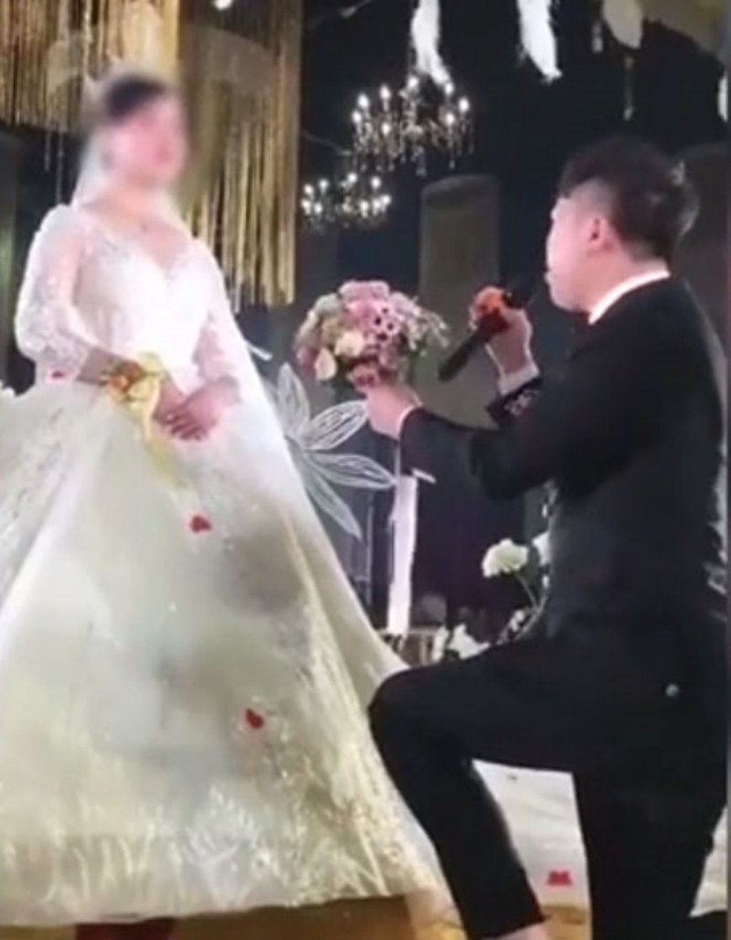 According to Sohu, the incident took place at a wedding in Guangdong. In the video, the wedding was held at a luxurious hotel, and the groom knelt down holding a bouquet and shouted, “Marry me!” However, the bride did not respond or show any signs of agreement or refusal.