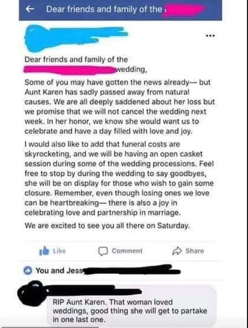 Her post read, “Some of you may have forgotten, but unfortunately, Aunt Karen passed away due to natural causes. We are deeply saddened by her loss but will not be cancelling the wedding next week. In fact, we know that Aunt Karen would have wanted to bless our wedding day with love and happiness.