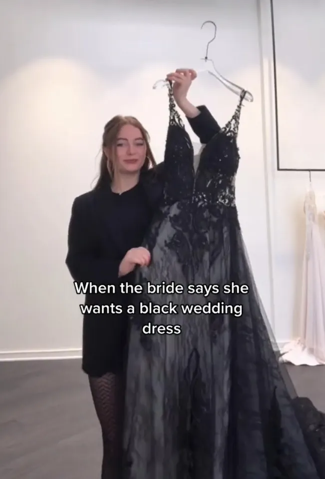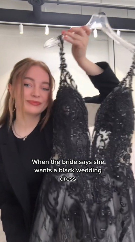 It certainly wasn’t going to be a white wedding as the content creator pointed to the dress and exaggeratedly explained: “When the bride says she wants a black wedding dress.”