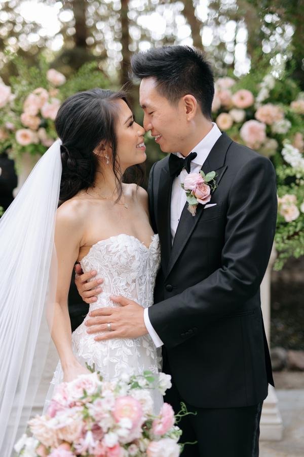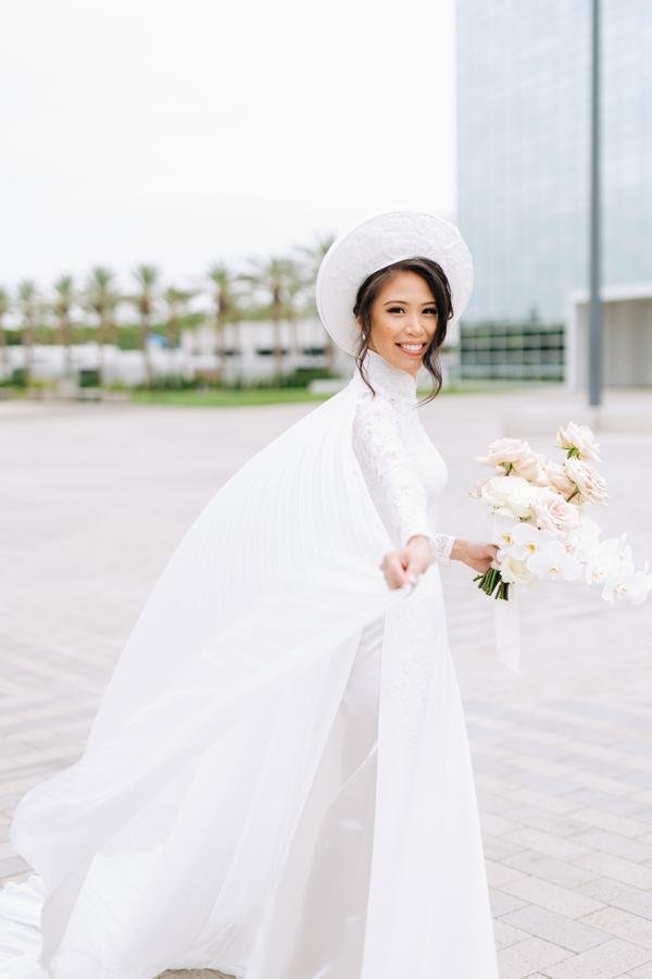 E had three beautiful dresses for her wedding day. For the morning church ceremony, she wore an ao dai, a traditional Vietnamese dress that symbolizes beauty and pride. For the second ceremony, she wore an A-line dress by Justin Alexander with floral appliqué and lace detail. Lastly, for the reception, she wore a mini dress with an ostrich feather trim from Bronx and Banco. Damien wore a classic black tuxedo from Suitsupply.