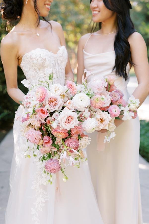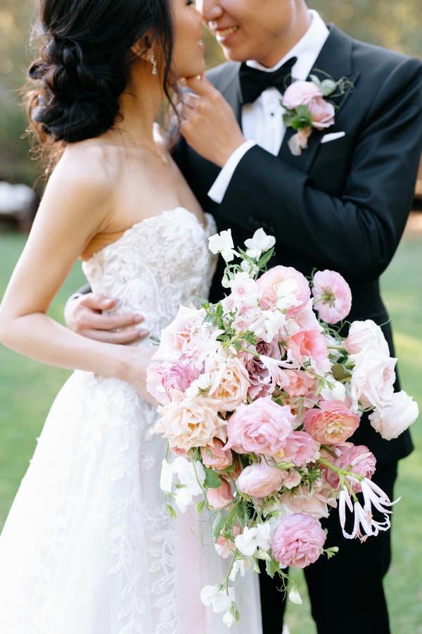 The florist, Azalea from Wild & Behold Florals, did an incredible job of bringing E’s vision to life. The venue was decorated with a melody of peonies, ranunculi, and garden roses. Large floral arrangements held by pillars and urns framed the aisles and sweetheart table, creating a whimsical garden soiree.
