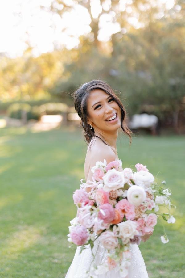 E and her partner had two ceremonies on the same day. The first ceremony was held at the Christ Cathedral in Garden Grove, CA, while the second ceremony was held at Calamigos Ranch, a small getaway resort nestled in the center of the Santa Monica Mountains. The second ceremony allowed them to exchange personal vows in a more fun and relaxed atmosphere. Exchanging vows was E’s favorite part of the day, as it was a moment they shared together without the wedding day bustle.