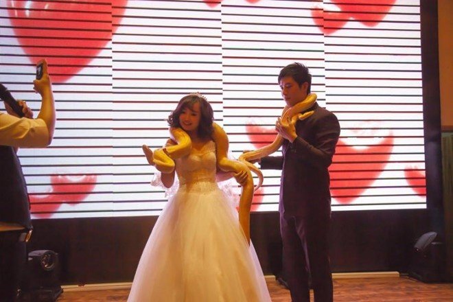 On September 16th, a couple from Cat Lam province in China, surprised guests at their wedding by exchanging vows with a pair of golden pythons as the objects of their commitment. Both the bride and groom are volunteers for a local organization that protects animals, and they have a passion for keeping exotic pets such as spiders, pythons, and lizards in their home.
