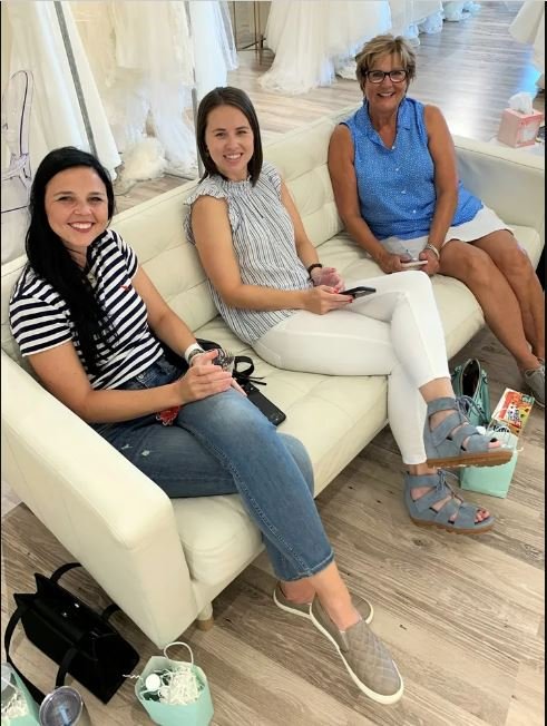 The bride was a little nervous going into the appointment due to Covid precautions. She had always dreamed of having a dress fitting with all of her best friends surrounding her, drinking champagne and ooh-ing and ahh-ing at all the beautiful dresses! However, she had to limit the number of people in her group for safety reasons, but it turned out to be the perfect amount. Her MIL lives in Sweden, so they were able to Facetime her in during the appointment.
