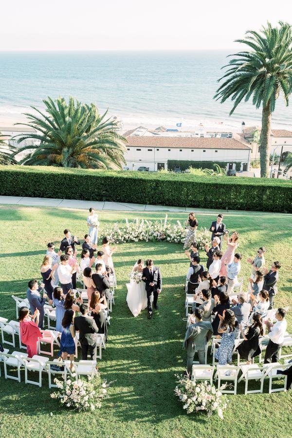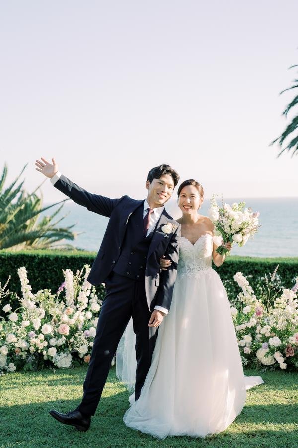 For their enchanting oceanfront wedding, E and her partner curated a charming floral decor by artfully blending fresh, organic-grown garden roses and seasonal flowers. Delicate blooms such as Butterfly Ranunculus, Scabiosa, Lavender, Larkspur, Sweetpea, and Oregano were carefully selected, each with their unique shapes and textures, to infuse an extra touch of sophisticated allure and natural lushness. The resulting ambiance was one of whimsical romance and timeless elegance, perfectly complementing the breathtaking sea view.
