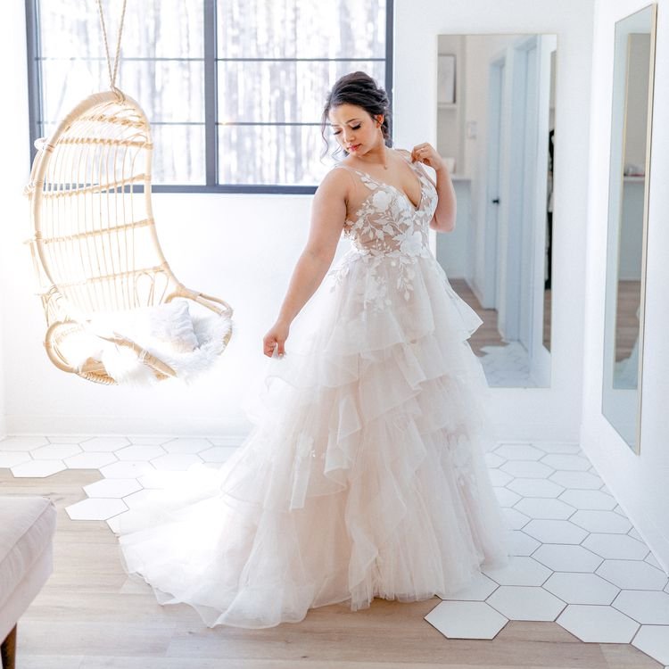 Additionally, the style of the gown can also change the way it fits. “Different silhouettes or back styles, like for corsets, for instance, can also impact the sizing of your gown,” Gardner notes.
