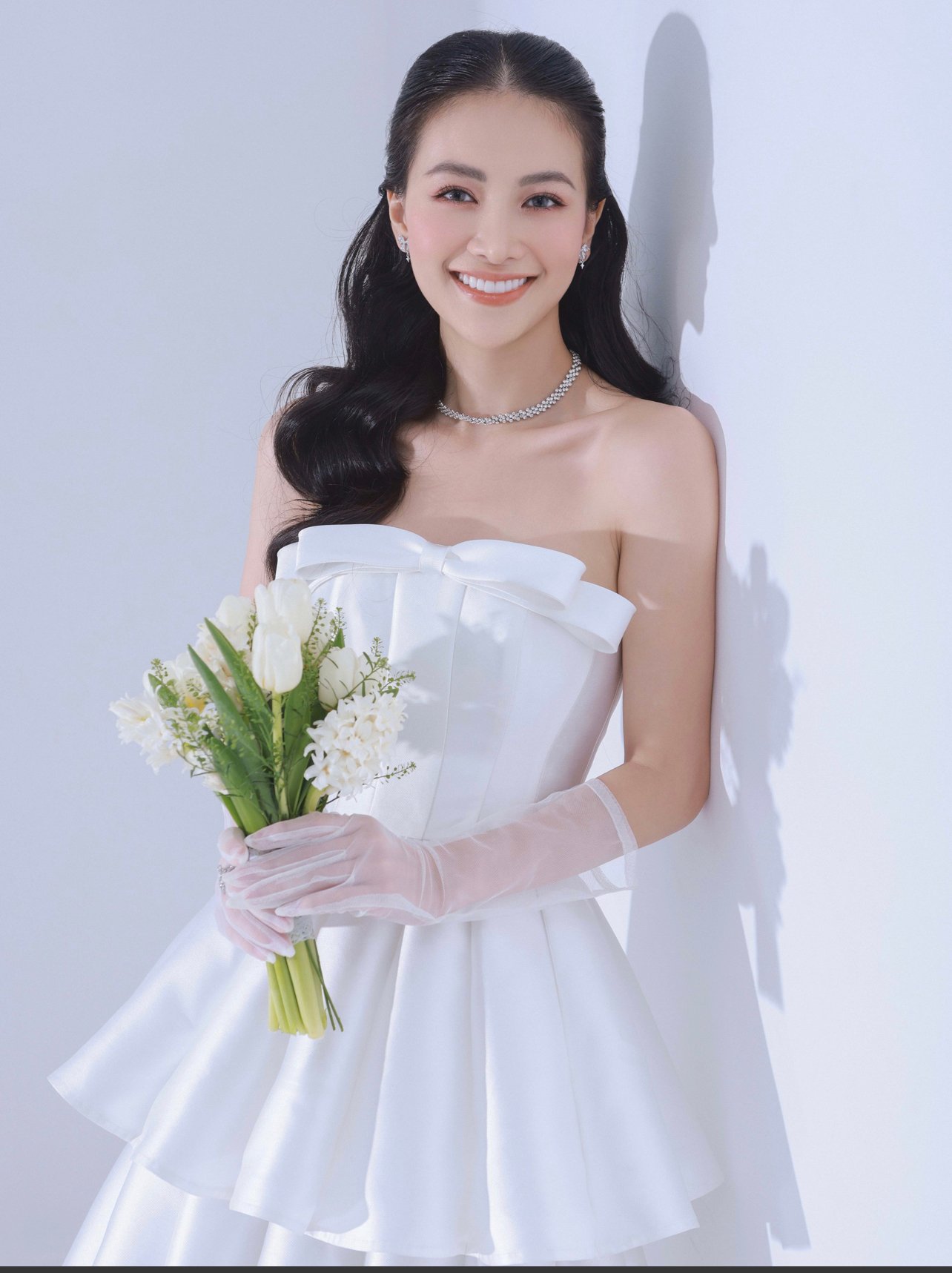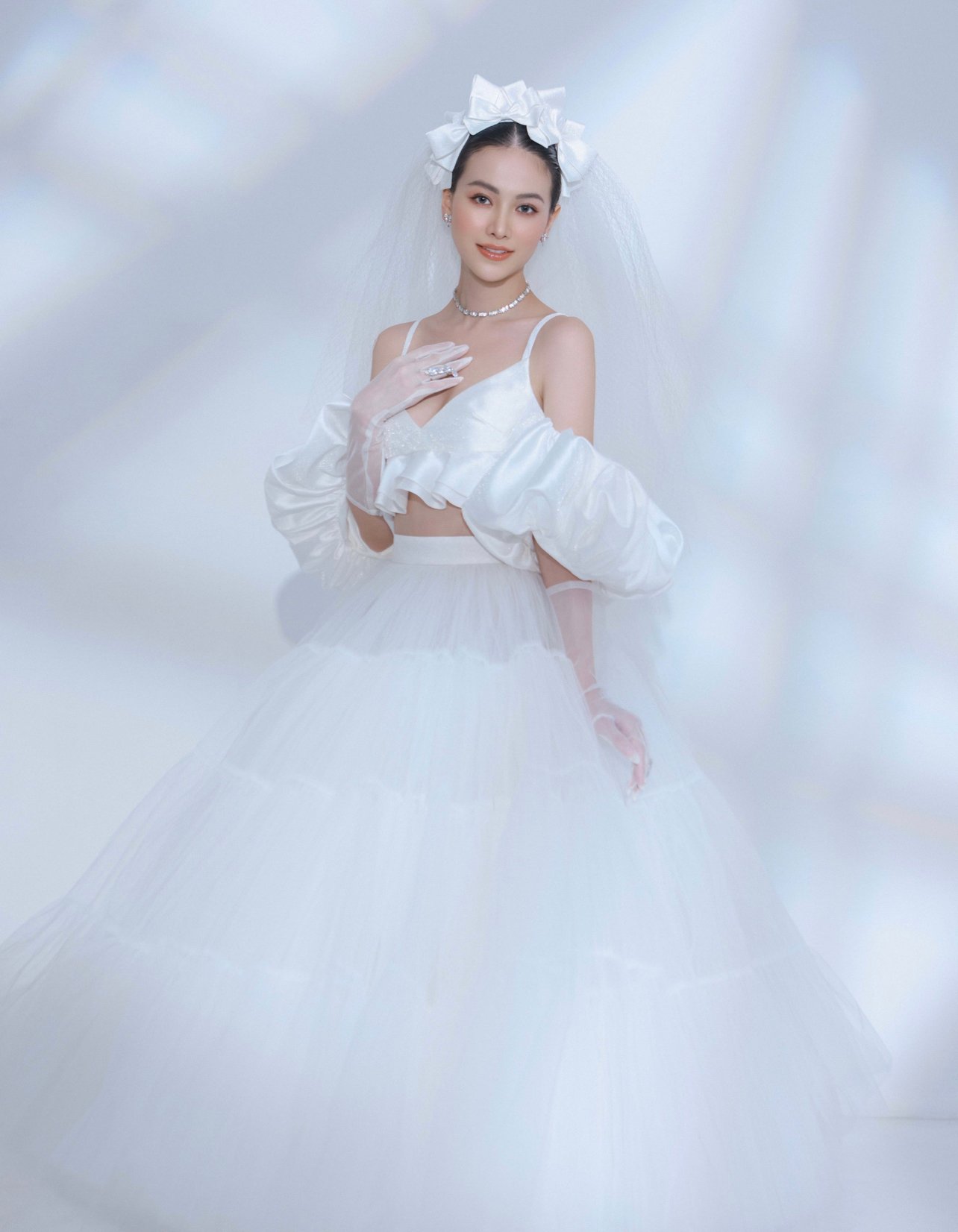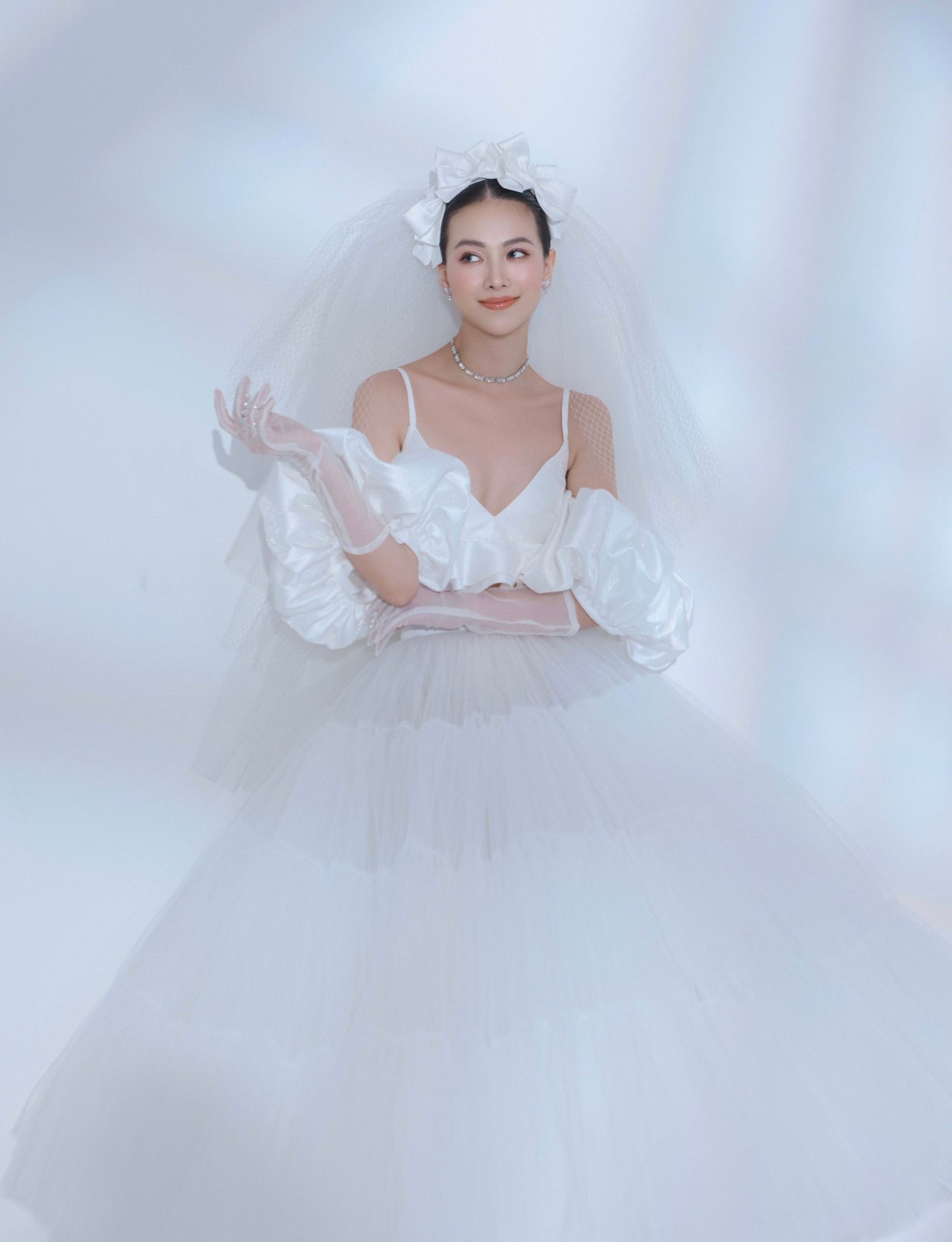 In response to the comments hoping for her to announce a happy news, Miss Earth Phuong Khanh clarifies that she only wore a wedding dress from the Yes I Do collection by designer Nguyen Minh Cong.