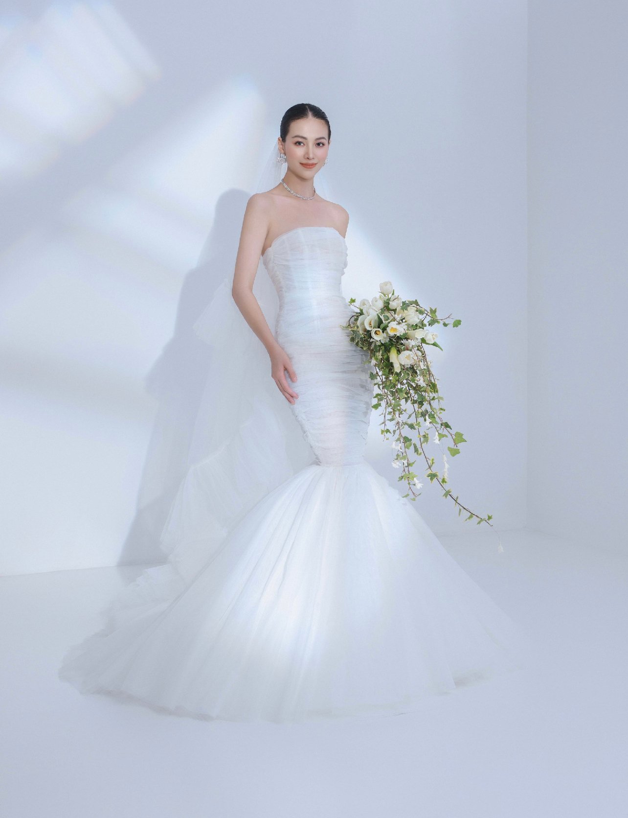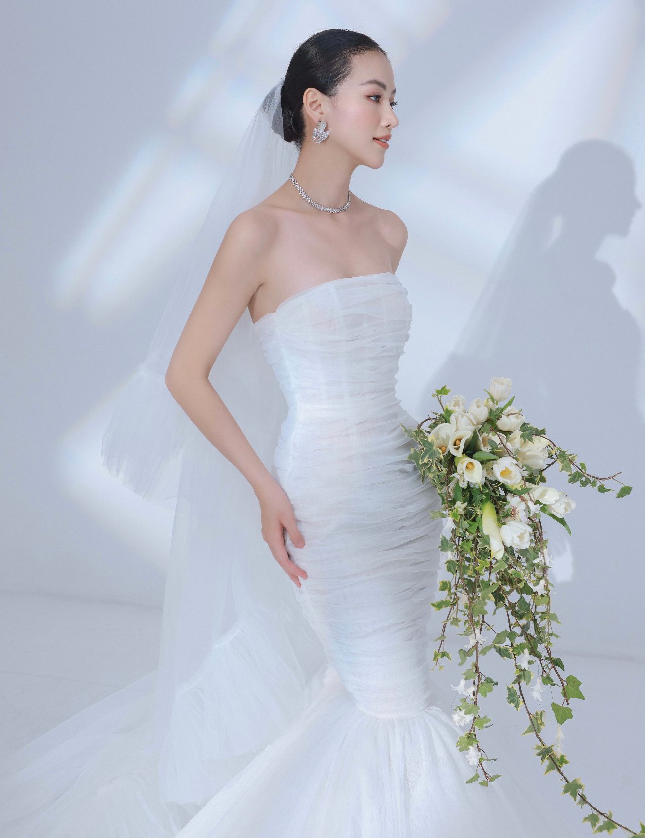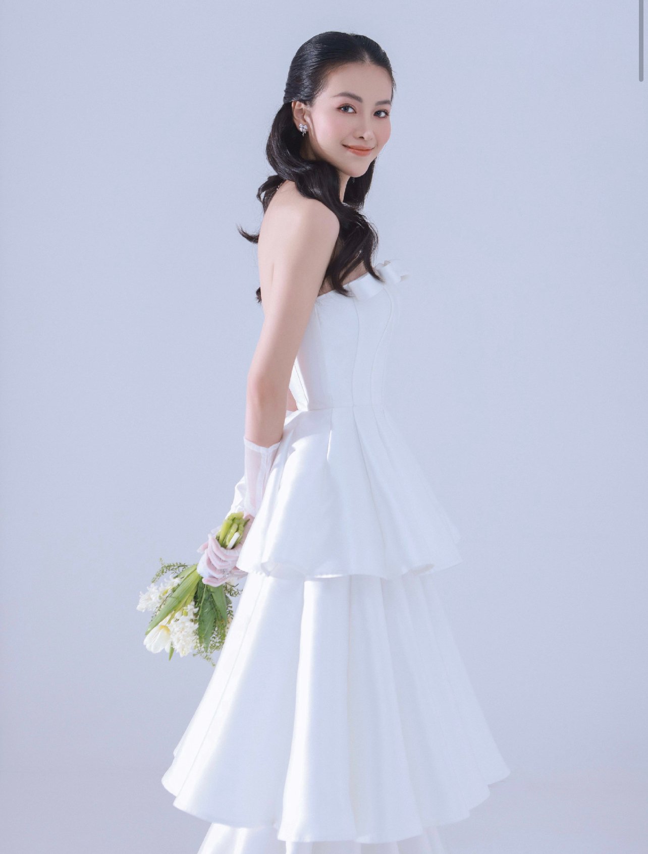 In response to the comments hoping for her to announce a happy news, Miss Earth Phuong Khanh clarifies that she only wore a wedding dress from the Yes I Do collection by designer Nguyen Minh Cong.