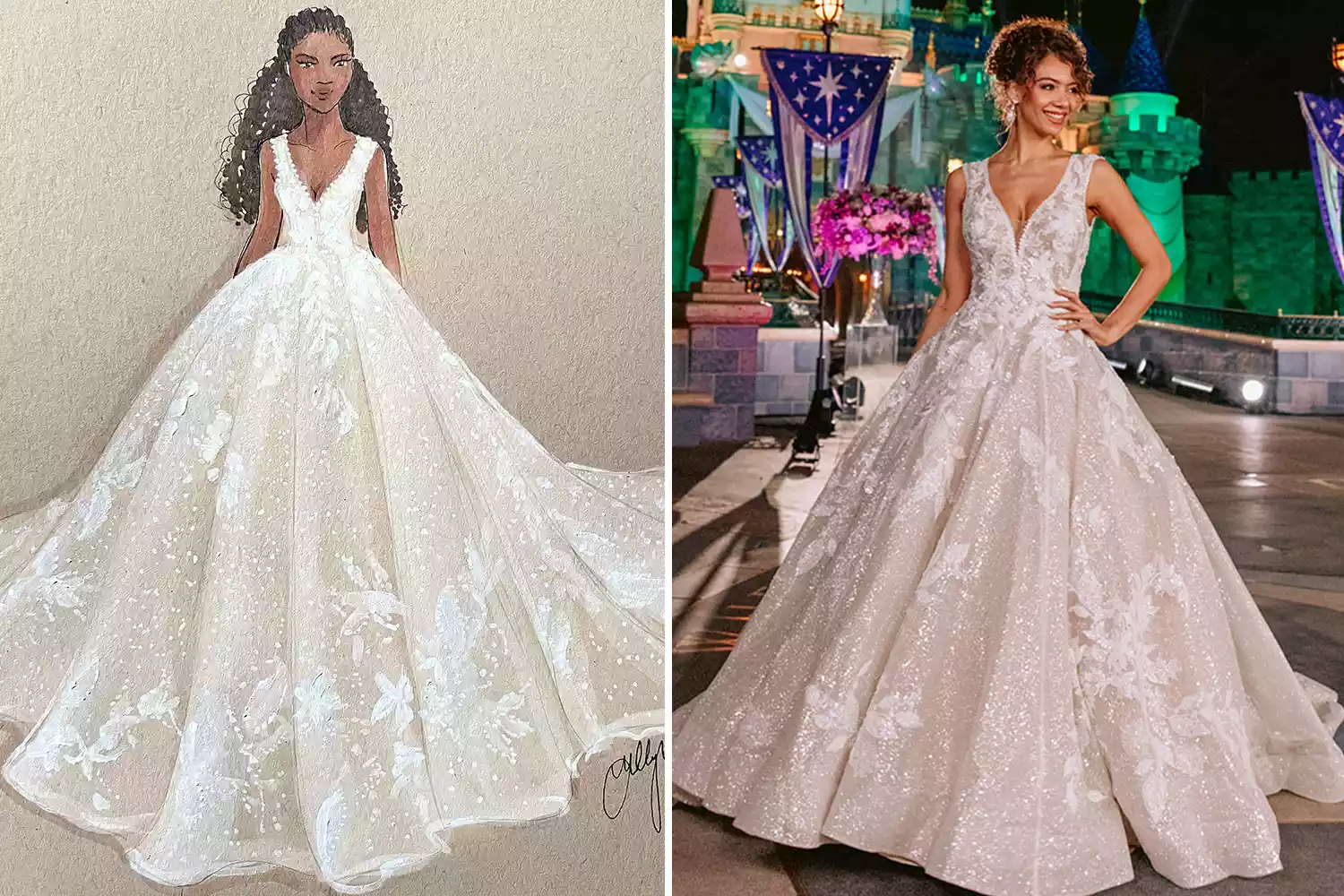 For the first time, the dreamy collection of 21 gowns also includes bridesmaid dresses, all of which are revealed Feb. 10 in a fashion show in front of the Sleeping Beauty Castle at Disneyland Resort in California.