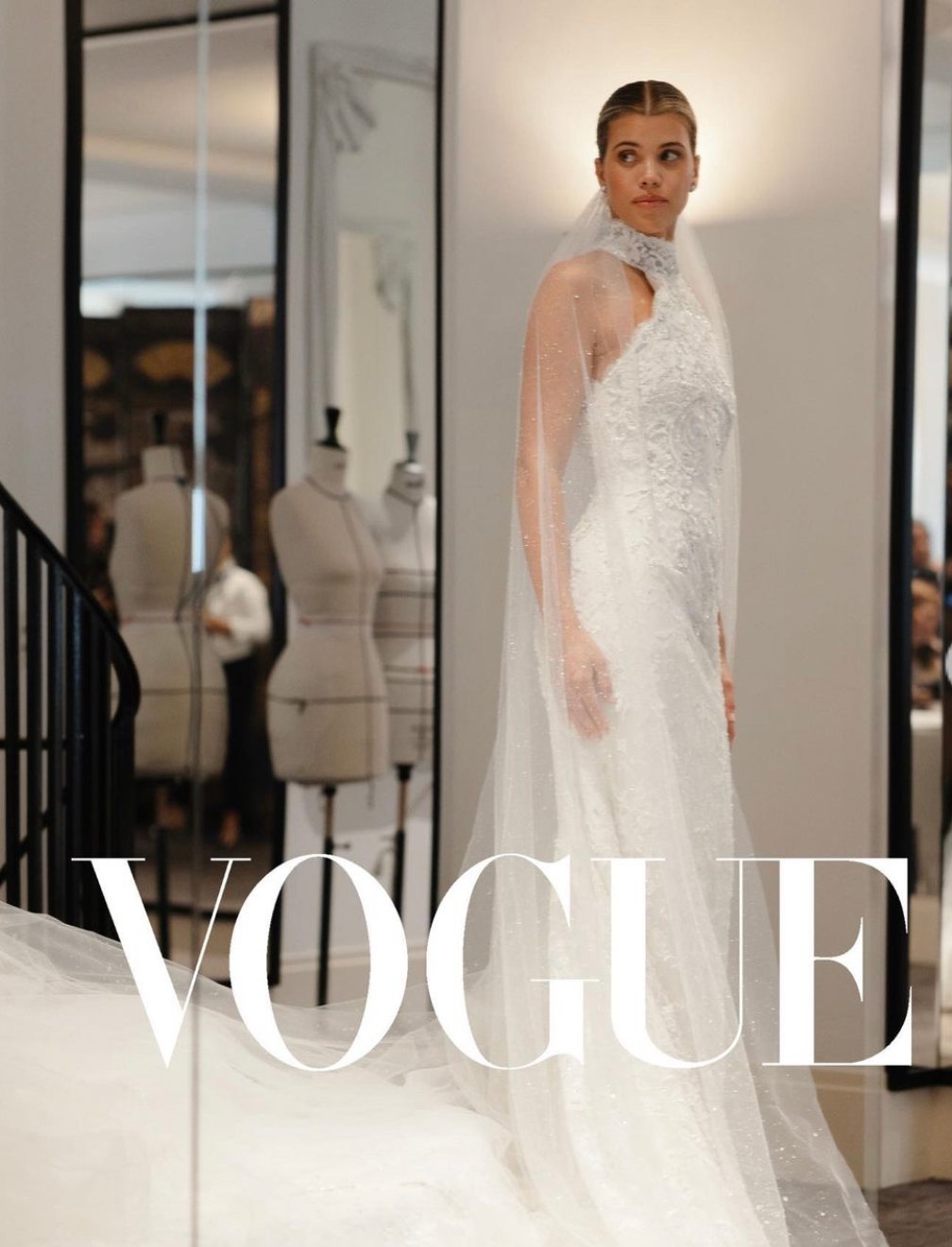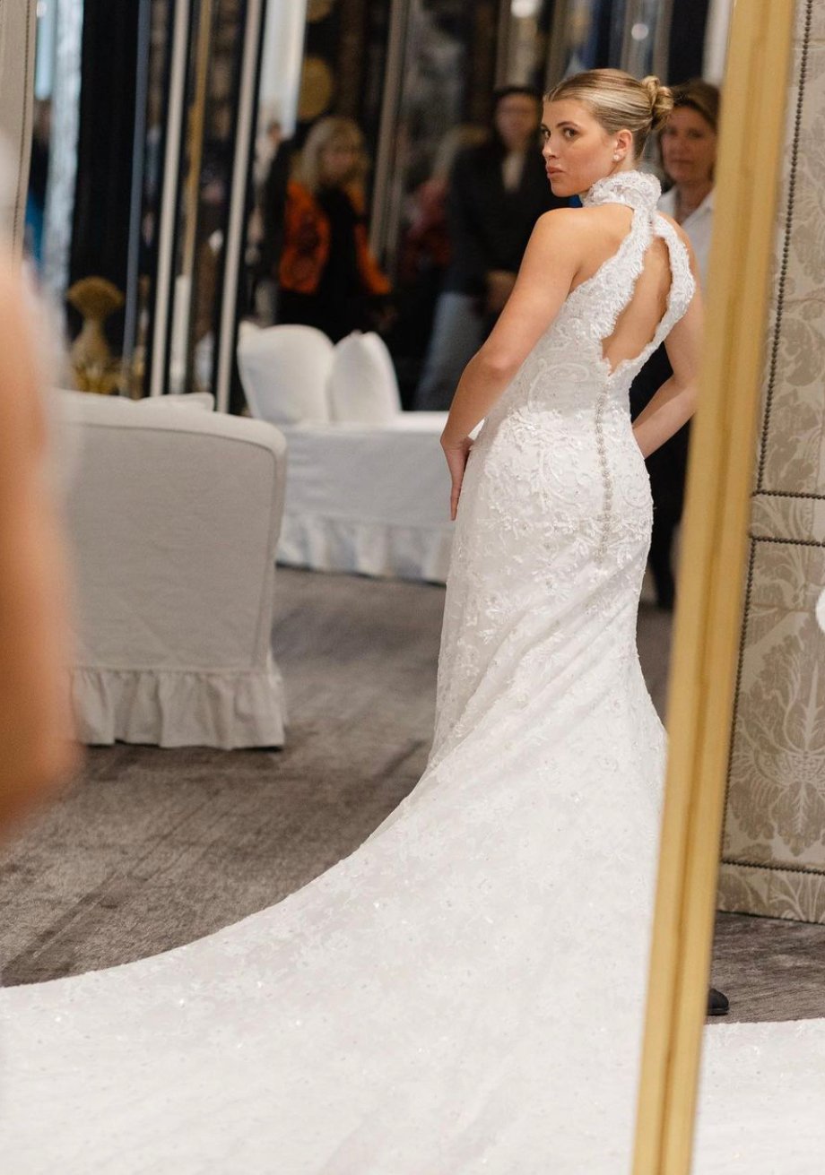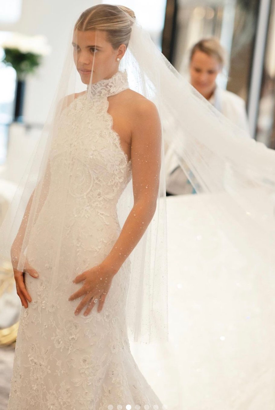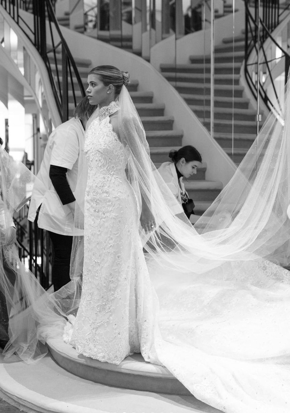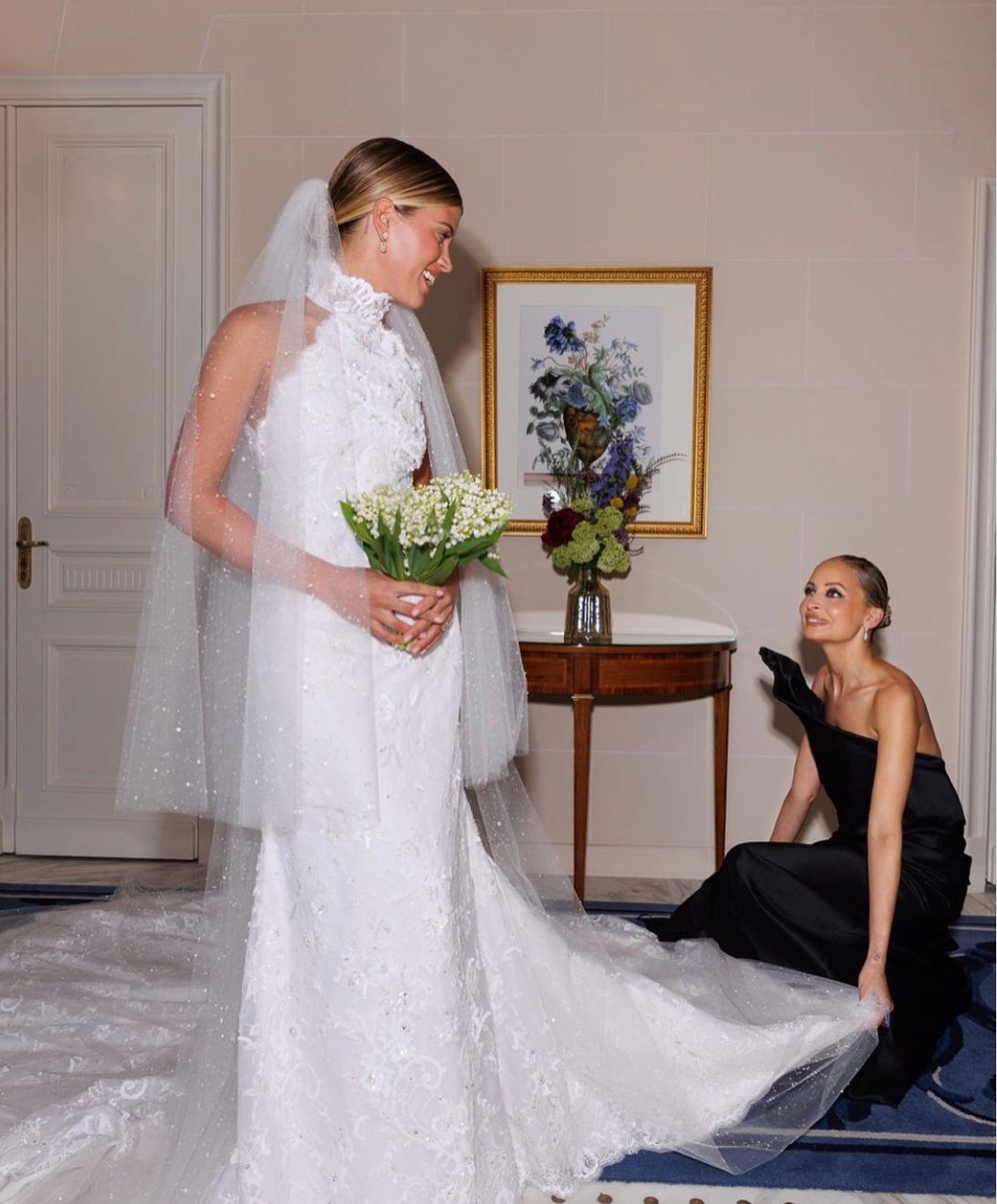 The media personality walked down the aisle in an embellished, lace gown with a criss-cross neckline that was inspired by a look from the spring/summer 2023 collection, but was adapted with various bridal details and special touches. This included her ‘something blue’ – the couple’s initials and the wedding date – which were sewn into the inner lining of the dress. The gown also featured a heart design in the lace in the middle of her chest, and another heart below, facing it; a hidden motif representing their love. Richie paired the dress with a dramatic veil, an elegant updo and a pair of diamond earrings.