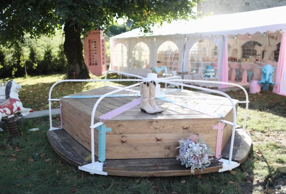 Mark and Drabble used tables and chairs from a local pub that was being demolished. Additionally, Drabble scoured the internet for cheap items instead of renting them, as she planned to sell them after the wedding. Some of these items included a 1920s-style carousel and an old electric car. They also searched for chairs, glasses, cake stands, candle holders, disco balls, and even a telephone box to decorate their wedding.