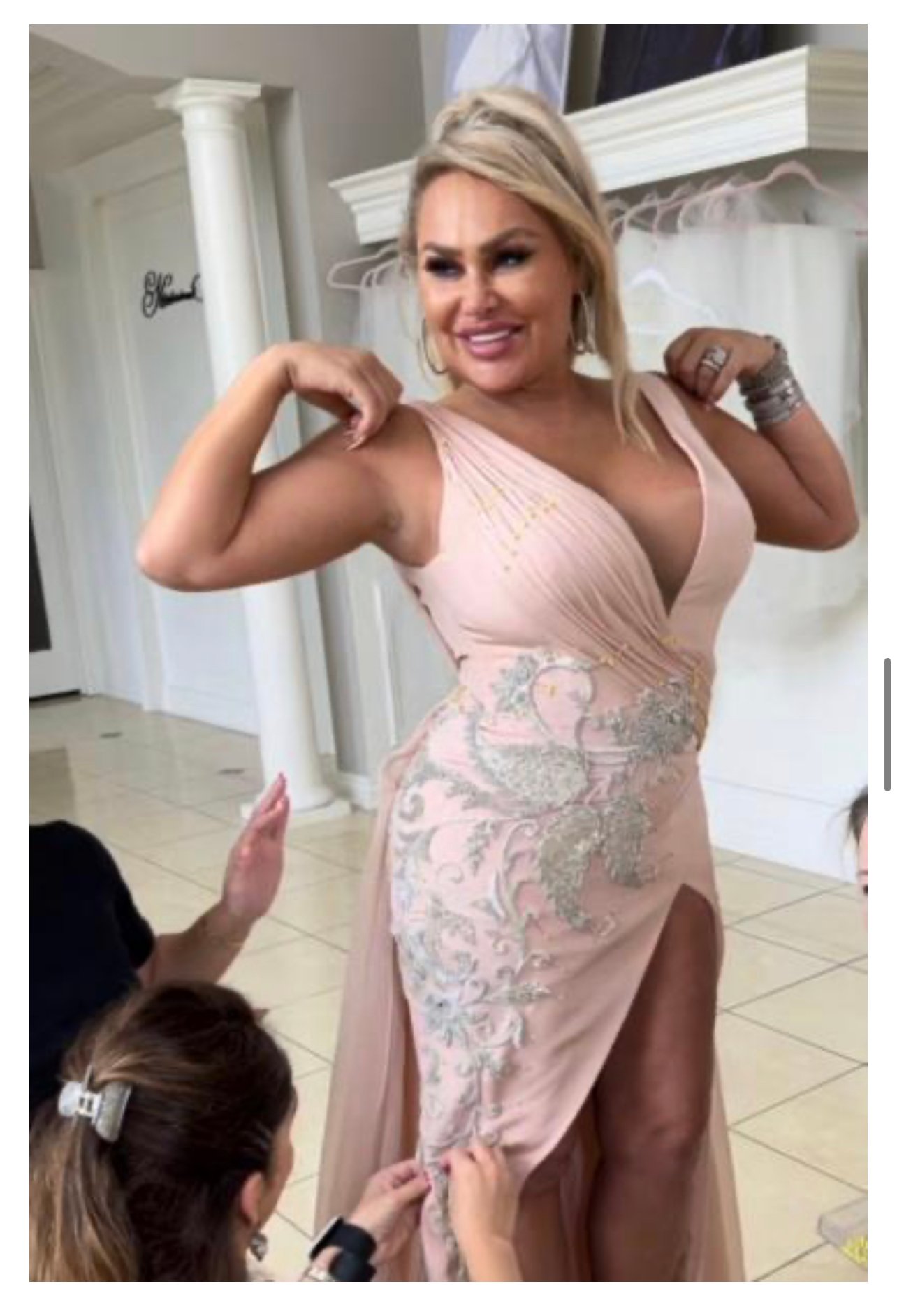 Darcey said we are twins, so I must use the same designer! We decided to go with a sexy fit for Darcey, which she loves. She has beautiful legs, so we created a high slit up one leg. We used a gorgeous silk crepe in a subtle color, handsewn Swarovski crystals, and hand-embroidered appliques. Her gown was a couture evening gown, fit for a maid-of-honor. Glamourous, perfectly fit to her body. She was stunning! Her look very much complimented Stacey’s glamorous gown.