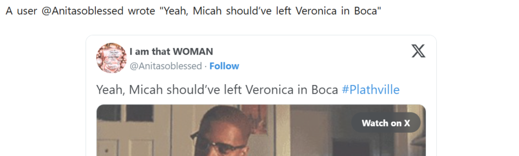 “Poor Veronica, the Plath men will always gaslight the women in their relationships because they don’t know what being a mature partner means. Micah clearly doesn’t know what he wants and you deserve better than an unhappy and unhealthy toxic life together.”