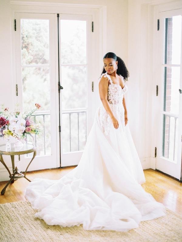 The bride’s dress was by Galia Lahav, and it was her garden dream dress. The lightweight and airy fabric was perfect for easy movement, and the dress was made to suck her in, so she didn’t have to work out or do anything. The bride went to six other bridal stores but ultimately loved the custom sleeves she added to her dress and that it was couture-made to fit her measurements, standing at only 4’9.