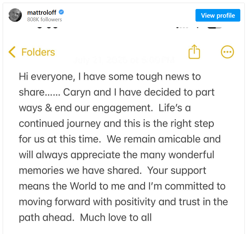 Little People, Big World star Matt Roloff and his longtime partner Caryn Chandler have officially ended their relationship after eight years together. The split comes just over a year after the TLC series aired its final season in February 2024. The pair first grew close when Chandler started working on Roloff Farms. Their friendship eventually turned romantic in 2017, and after six years of dating, the couple got engaged in 2023 with plans to marry in 2024. However, the wedding never materialized. The couple repeatedly postponed their plans, and unresolved family issues appeared to take a toll on their future together.